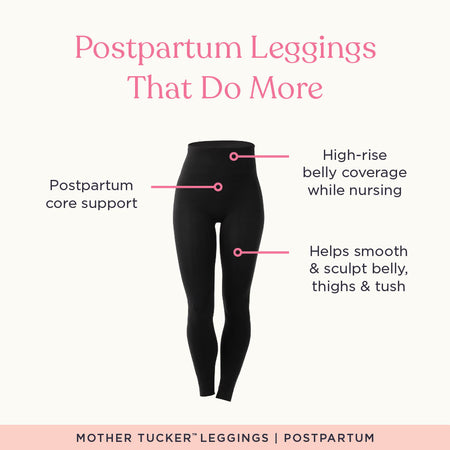 These leggings were made for motherhood! Our Mother Tuckerยฎ Postpartum Leggings feature an ultra-high waistband that provides complete coverage - perfect for discreet nursing and the postpartum core support you crave, as it hits right underneath the bra line. You won't have to worry about digging as these Mothers provide a cinch without a pinch. Muffinologyยฎ Technology is what gives these leggings their superpower and the soft, breathable fabric will help smooth you from the waist down. So pack them in your hospital bag and wear them happily ever after...these comfortable, versatile leggings will give you the confidence to go where motherhood takes you.